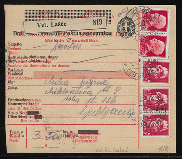 Italienische Besetzung Laibach 1942, Italien Freimarken 75 C. im Paar nebst dreimal 2 L. auf Paketkarte aus Vel. Lasce