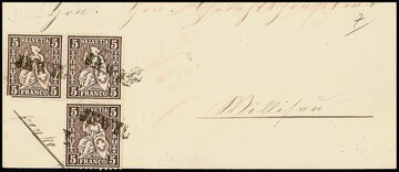 "Inwil", besserer L1 auf Brief (oben etwas verkützt, Marken kl. Mgl.) mit Dreierblock 5 C. braun (30)