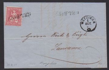 "Kempten", L1 nebst K1 "Wetzikon" auf Brief 10 C. rosa 1867 (30)