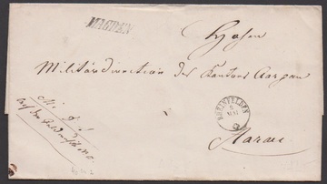 "Magden", Schrägschrift-L1 nebst K1 "Rheinfelden" auf Brief 1855 (40)