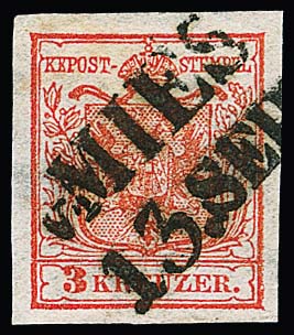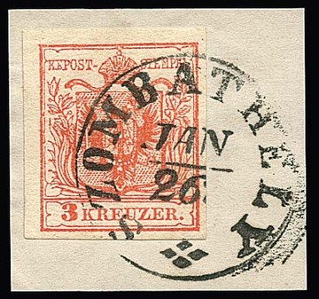 "Mies", seltener Böhmen-L2 "v. MIES" voll auf Kabinettstück 3 Kr. rot, Müller 1692a/300 P.