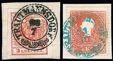 "Trautmannsdorf", besserer Oberösterreich-Zier-K2 in schwarz bzw. blau je klar auf zwei Kabinettbriefstücken 3 Kr. rosa bzw. 5 Kr. rosa, Müller 2968a, ab/85 P.
