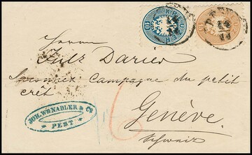 10 Kr. blau und 15 Kr. ockerbraun auf Kabinett-Faltbrief (1866) mit K1 "Pesth" nach Genf. Aus Ungarn nicht häufiger Brief in die Schweiz