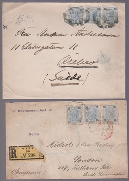 25 H. schw./blau per drei auf Recobrief (Gebrauchserhaltung) von Wien nach London, sowie ebenfalls per drei auf Couvert 1901 nach Schweden