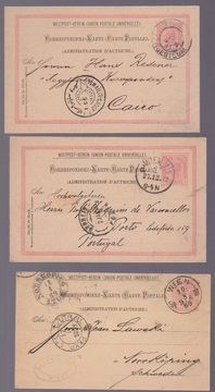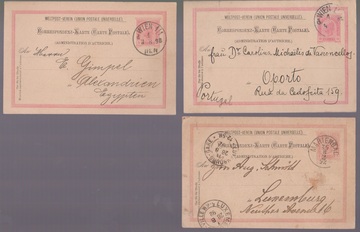1892-1903, drei Ganzsachenkarten 5(2) bzw. 10 Kr. mit ungewöhnlichen Destinationen, Portugal, Luxemburg und Ägypten