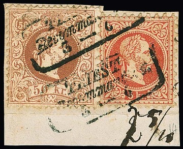 Zwei Briefstücke Franz Joseph: 2 Kr. gelb, 3 Kr. grün und zweimal 5 Kr. rosa (Ovalstempel "Triest"), sowie 5 Kr. rosa und 50 Kr. bräunlichlila auf Briefstück mit Ra3 "Triest Recommandirt"