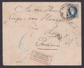 10 Kr. blau sowohl vorder- (ein Zahn) als auch rückseitig auf R-Brief von Prag 1882 nach Stolp mit besserem R-Zettel "Vom Auslande über Bahnpost 20 (Dresden-Bodenbach)"