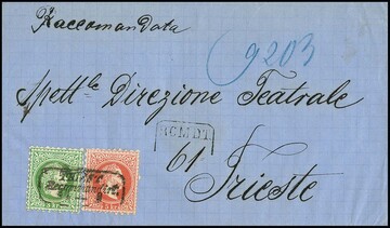 3 Kr. grün und 5 Kr. rosa (bereits mit unauffälliger Vorfaltspur aufgeklebt) vorderseitig auf eingeschriebenem blauem Orts-Couvert mit Ra3 "Triest Recommandirt"