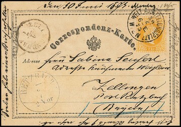 Franz-Joseph-Ganzsachenkarte 2 Kr. gelb mit seltenem frühem Sonderstempel "Welt-Ausstellungsplatz Wien", 30.6.1875, bedarfsmäßig (leichte Spuren) nach Bayern gelaufen