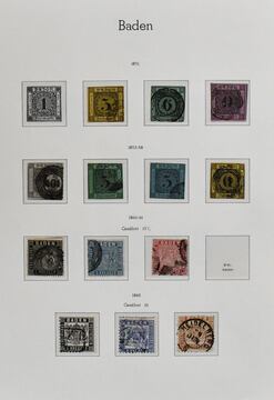 Baden, meist gest. und bis auf Nr. 14 u. 16 überkpl. Slg. auf Leuchtturm-Vordrucken ab Nr. 1-12, inkl. Nr. 3a/b, dabei zusätzlich Paar Nr. 9 mit Uhrrad "1", 15a/b, Nr. 21a gest. etc., Landpost ungebr. usw.