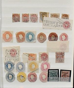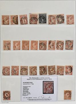 Sachsen, Spezialslg. der Nr. 12 (5 Ngr. in Nuancen), 32 gestempelte Werte (zwei Briefstücke mit Buntfrankaturen) und drei ungebrauchte, dabei auch Nr. 12d (gepr. Rismondo) und 12e (6, oft gepr.), sowie die sonstigen Farbnuancen