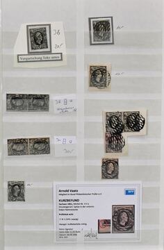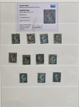 Sachsen, Steckbuch mit einer Vielzahl von einzeln beschriebenen Besonderheiten, u.a. zwei Paare Nr. 3a, 3a mit Verquetschung, 4I ungebraucht, 4II diverse Werte mit Randbesonderheiten wie Randspitze (Befund Vaatz), Eckwinkel etc., Luxusbrief Nr. 4, blaue VG und K1 je auf Nr. 4, Nr. 5 zweimal mit Plattenschaden, Nr. 6 vielfach, u.a. auf Brief, mit Randbesonderheiten und viermal mit Plattenschaden, Nr. 7 mit hohem NS ("73"), Nr. 8 u.a. linke obere Ecke, sehr dickes, dickes und sehr dünnes Papier, dreimal DD-ähnlicher "Schmitzdruck", Nr. 9 gemaschtes und gestreiftes Papier, "hohe Ziffern", öliger Druck, zwei postfrische Paare Nr. 10c, große gest. Ecke Nr. 10, "Schmitzdruck", Nr. 11 Ecke links oben, "fehlende Ecke", Retusche, mehrf. fehlende Einfassungslinie, Nr. 13 gest. (2) etc. Vieles ex Bolte und Milde