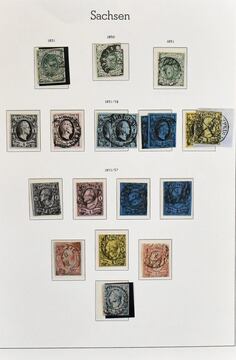 Sachsen, 1850/1867, vollständige Sammlung mit allen besseren Werten, allen voran eine Nr. 1 in seltener c-Farbe (restauriert und auf Briefstück montiert, Befund Rismondo), optisch jedoch ein attraktives Exemplar (Mi. 13.000,-), Nr. 2/7, 12 per drei, 13, je gestempelt, bis Nr. 19