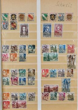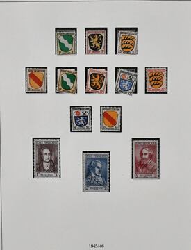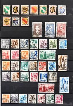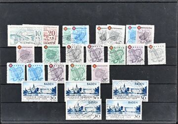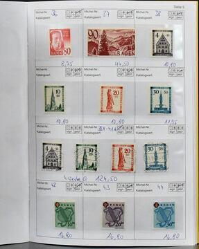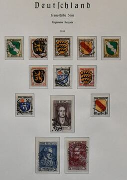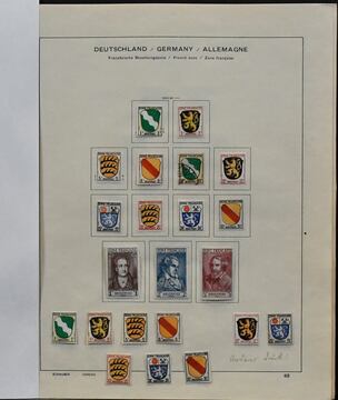 Französische Zone, 1945/49, gestempelter, sortenreicher Bestand von rund 2500 Werten, immer wieder mit besseren Ausgaben, im dicken E-Buch. Dabei zehn Rotkreuz-Werte, Baden Nr. 28/37 mehrf., 38/41A, 50/57, meist mehrf., Rheinl.-Pfalz Nr. 30/31 mehrf., 32/41, 49/52 mehrf., Württemberg mehrf. Nr. 36/37 usw. Mi., billigste Type gerechnet, bereits 10900,-