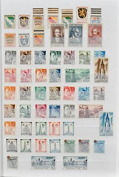 Französische Zone, E-Buch mit über 1000 meist postfrischen und etwas ungebr. Werten. Dabei Allg. Ausgabe mehrfach, Nr. 1/13, inkl. Nr. 1/10 in postfr. Zwischenstegpaaren (Mi. billigst 154,-), Baden Nr. 37, Rheinland-Pfalz mit 13 postfr. Rotkreuz-Werten (Mi. 286,-), Württemberg Nr. 37 mehrf., Nr. 38/39 usw.