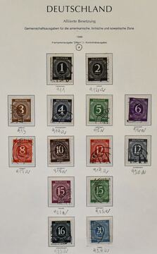 Gemeinschaftsausgabe, 1945/49, gest. kpl. Slg. inkl. Bl. 12A/B mit SST (Mi. 420,-), VZd1 auf Gedenkblatt usw., auf Vordrucken