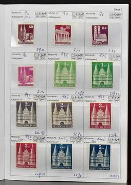 Bizone, 1945/1949, gest. Slg. ab AM-Post, mit Nr. 36/51I/II (Mi. 400,-), inkl. Nr. 49I, Bauten eg, wg und beiden Typen der Mark-Werte, Nr. 101/10, Bl. 1 mit Ortsstempel (Mi. 350,-), Einzelwerte aus Bl. 1 mit anhängenden Blockrändern inkl. 10 Pfg. per zwei (Mi. 240,-), Nr. 101/10 usw.