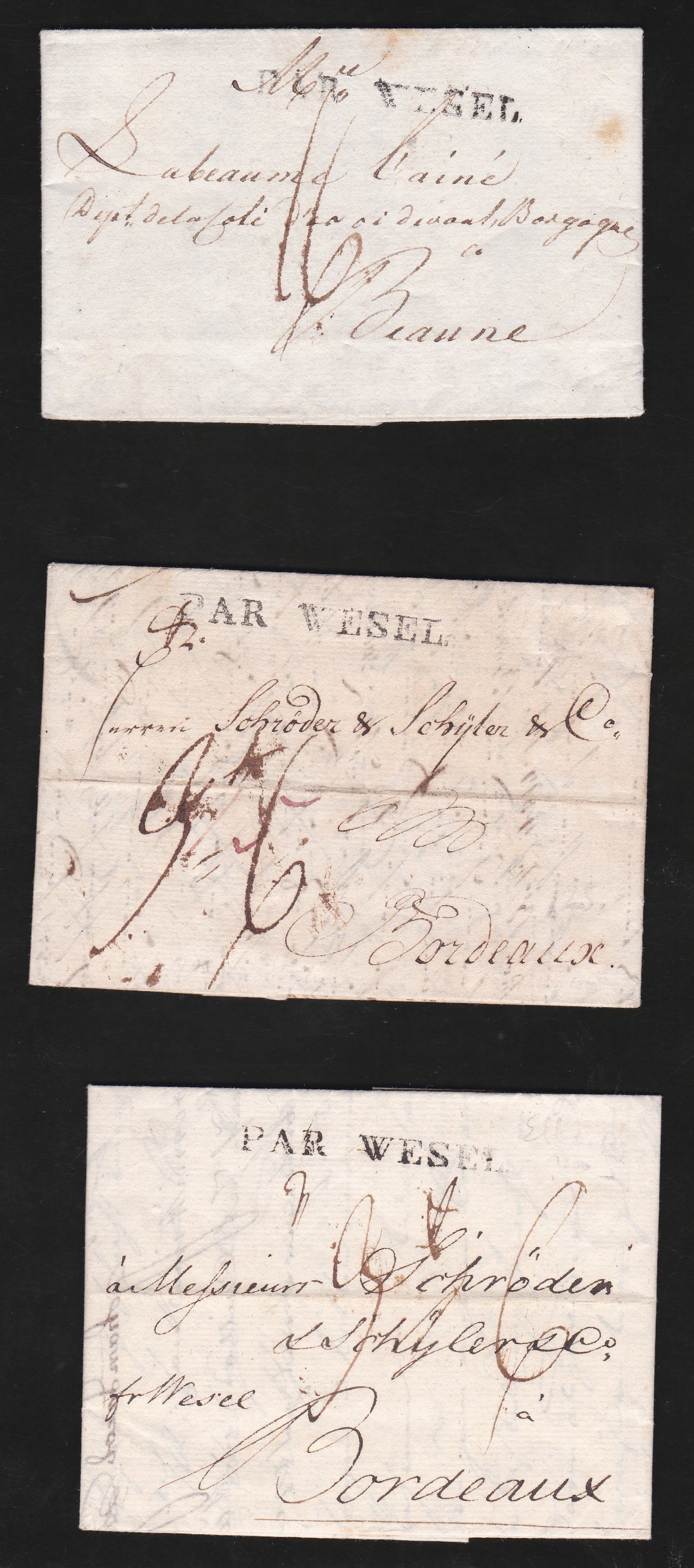 "Par Wesel", L1 auf drei Briefen aus Elbing, Stettin bzw. Wesel je nach Bordeaux 1798-1801