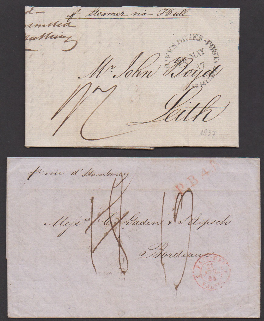 "Schiffsbriefpost Hamburg", Einkreiser rs. auf Brief von Porto Cabello/Venezuela 1844 via Hamburg (!) nach Frankreich, sowie vs. auf Brief 1837 von Copenhagen nach England