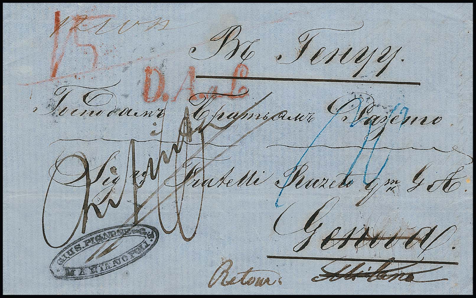 "Polen-Italien", 1859, Brief von Marianpoli über Lemberg und Wien nach Genua (roter L1 "D.A.a.L.") und retour, rs. weitere Stempel