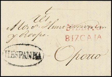 "Spanien-Portugal", 1816, zwei Briefe je mit rotem L2 von Bilbao bzw. Alicante nach Porto, je schwarzer Ovalstempel "HESPANHA"