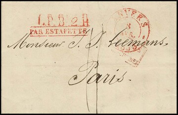 "L.P.B.2R.", roter L1 nebst seltenem Ra1 "PAR ESTAFETTE" auf Brief 1833 von Antwerpen nach Paris