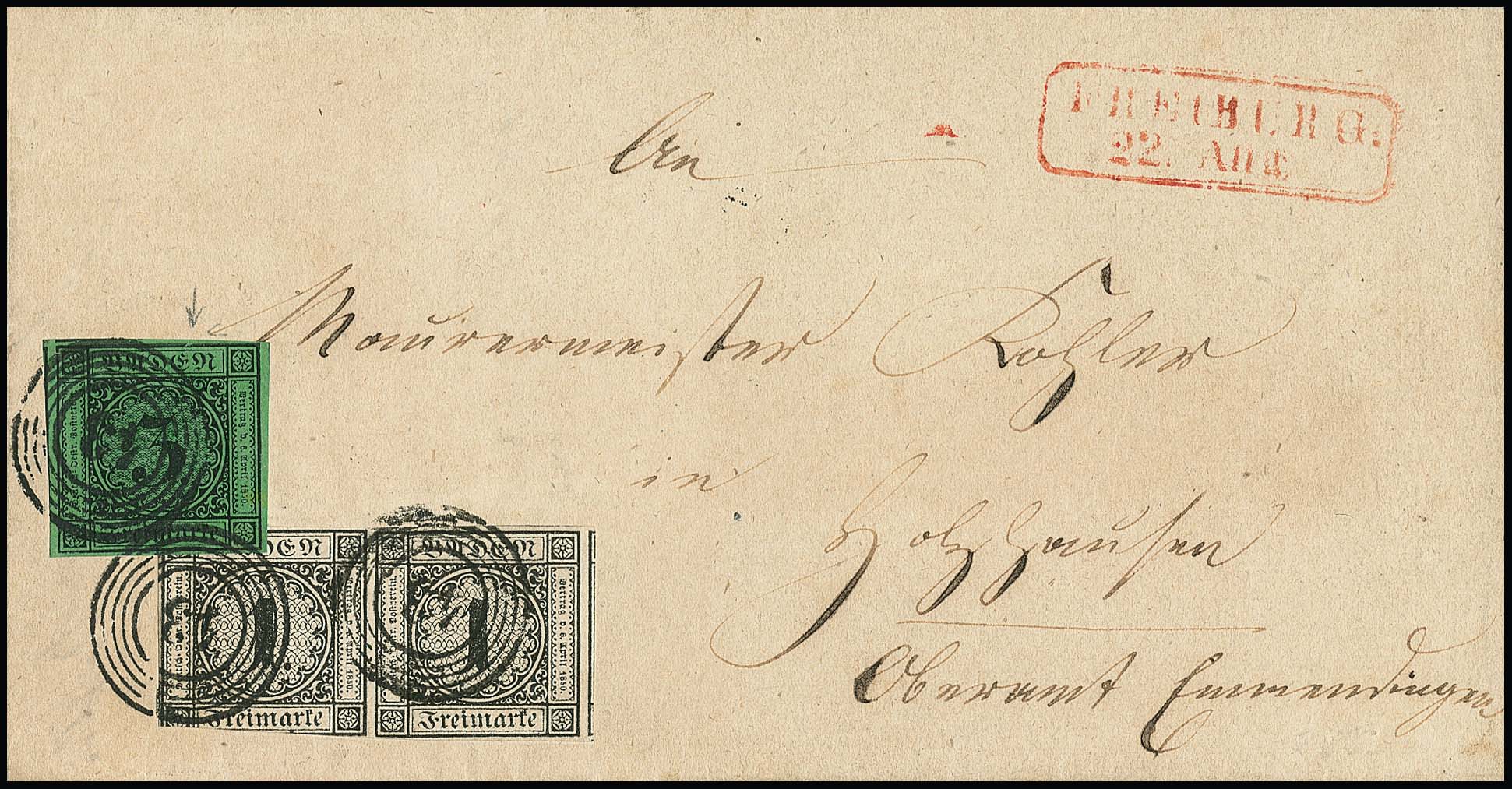 1 Kr. schwarz im waager. Paar, rechte Marke breitrandig, linke unten angeschnitten, als vorausbezahltes Landbestellgeld, nebst breitrandigem Kabinettstück 3 Kr. schw./grün mit Plattenfehler oben, auf Faltbrief von Freiburg (NS "43" und roter Neben-Ra2) nach Holzhausen im Landbezirk von Emmendingen