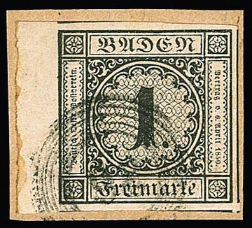 1 Kr. schwarz, riesenrandig auf Kabinett-Briefstück, links 5mm Bogenrand, alle anderen drei Seiten Nebenmarken (!), sign. Bühler