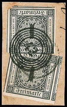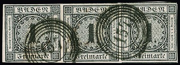 1 Kr. schwarz, teils sehr breitrandiger Kabinett-Dreierstreifen mit NS "157", oben und unten Nebenmarken, deutliche Klischee-Verschiebung, rs. Tintenspiegel = völlig ursprünglich, sign. Frey