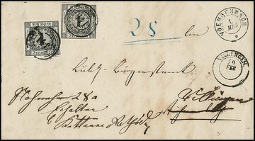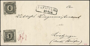 1 Kr schwarz, zwei Prachtstücke auf doppelt versandtem Nachnahmebrief mit NS "148" und K2 "Villingen" sowie "149" nebst K2 "Voehrenbach"