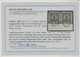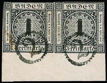 1 Kr. schwarz, ungewöhnliches waagerechtes Paar mit bis zu 13mm breitem unterem Bogenrand und Uhrradstempel "2" (und links kleine Tintenspur), zwei kleine Eckbüge, sign. Pirl und Fotoexp. Stegmüller