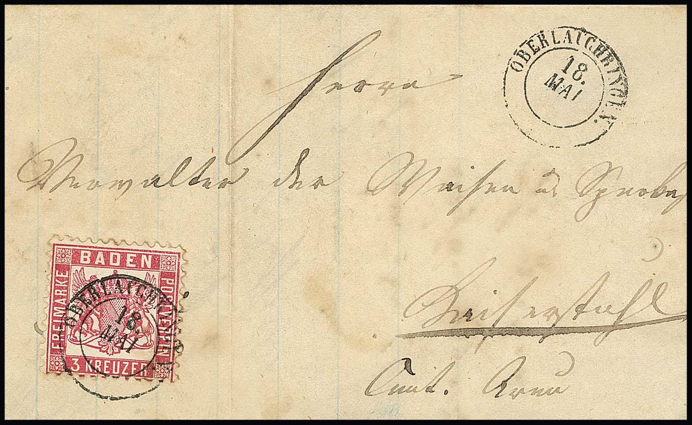 3 Kr. rosa, Prachtsück auf Grenzrayon-Brief 1868 von Oberlauchringen nach Kaiserstuhl, in den Kanton Aarau