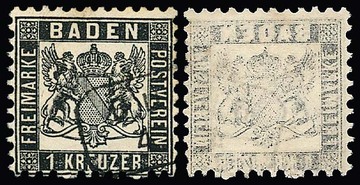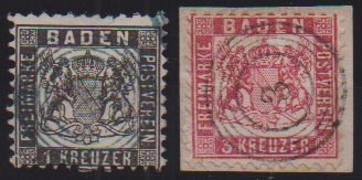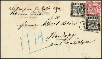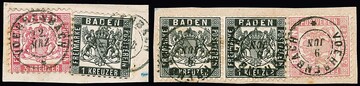 6 Kr. orange (kl. Eckzahnbug) in seltener Mischfrankatur mit 3 Kr. rosa auf Briefstück mit NS "37" (Endingen), aus der Maus-Slg., sign. Kruschel (Auktion 1985), ferner 1 Kr. schwarz und 6 Kr. blau auf Kabinettbriefstück mit Ra2 "Carlsruhe"