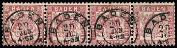 3 Kr. rosa, seltener waagerechter Viererstreifen, rechts kurze Zähne und zweite Marke bereits mit Mängeln verwandt. Mi. 1000,-