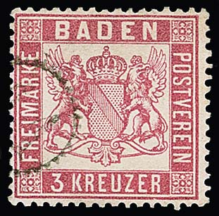 9 Kr. karmin mit ausgabetypisch kleinen Unregelmäßigkeiten im Bereich der Perforation, aber sauber gestempelt mit NS "79" und gut sichtbarem, seltenem Plattenfehler "Farbzunge am I von POSTVEREIN", sign. Seeger. Mi. 900,-