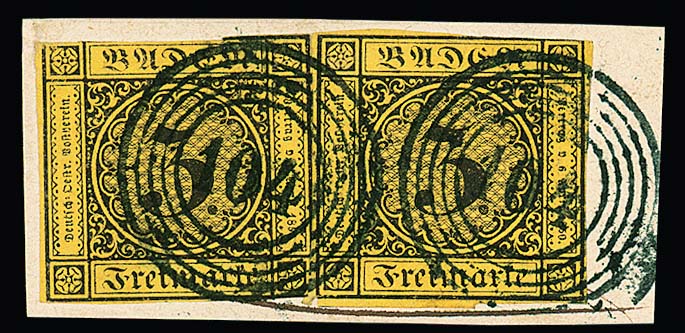 "Emmendingen-Nimburg", nebst K2 "Emmendingen", je nachverwendet, als kuriose Doppelentwertung auf rechts unten etwas hinterklebtem Prachtbriefstück 3 Kr. kl. Brustschild, Fotoexp. Krug