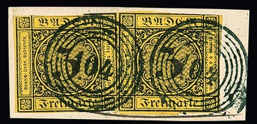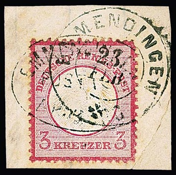 "104" (Offenburg) in blau klar auf Briefstück mit zweimal 3 Kr., 1. Auflage (einmal etwas unebener Schnitt), sign. Brettl