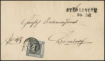 "141" nebst L2 "Stuhlingen" auf Brief mit dreiseitig voll- bis breitrandiger 1 Kr. schwarz nach Bonndorf