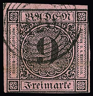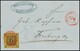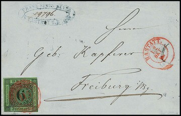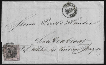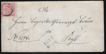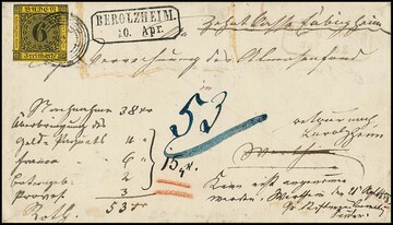 "9" nebst Ra2 "Berolzheim", seltener NS auf doppelt verwendetem NN-Retourbrief mit 6 Kr. 1854 nach Wertheim