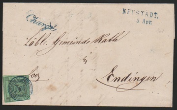 "100" nebst L2 "Neustadt", je in blau und sehr klar, auf "Chargé"-Brief (gleichfalls blauer L1) mit üblich geschnittener 3 Kr. schw./grün