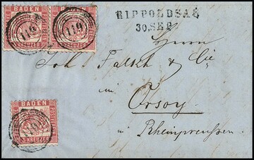 "119" nebst L2 "Rippoldsau" auf Brief 3 Kr. karmin per drei 1864 nach Orsoy, rs. Bahnpost-L3 "Mainz-Coeln"