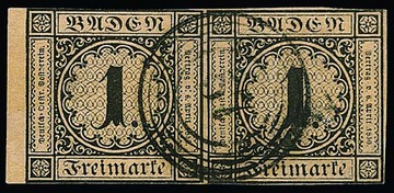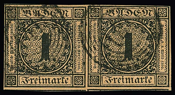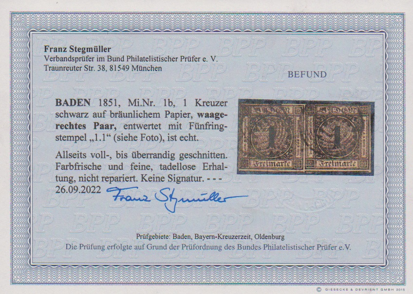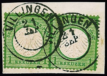 1 Kr. schw./bräunlich allseits breit- bis überrandiges Kabinettpaar (drei Seiten Nebenmarken!), Fotoexp. Stegmüller. Mi. 750,- ++