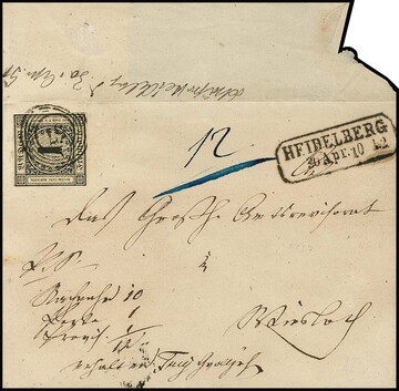 Vorersttagsbrief: Brief, rückseitig handschriftlich datiert "Heidelbg. d. 30. apr. 51", klarer Neben-Ra2 "Heidelberg" vom "30. April", als Nachnahme nach Wiesloch. Die mit Falz befestigte 1 Kr. schw./sämisch in guter Qualität (sign. Bühler), jedoch offensichtlich nachträglich zu Demonstrationszwecken aufgeklebt, da die ursprünglich abgestempelte 1 Kr. (NS-Teile eindeutig echt) entfernt wurde. Dennoch ein sehr ungewöhnliches Stück, m.W. kein weiterer Vorersttagsbrief registriert