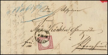 "Waldshut", handschriftliche Bahnpost-Aufgabe, nebst seltenem nachverw. Zug-K1 "Constanz-Basel", auf Brief (re. oben rote Farbe) mit tadelloser 3 Kr. gr. Brustschild, Attest Brugger