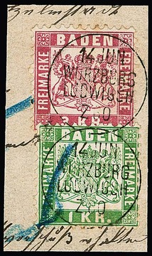 "Würzburg-Ludwigsh.", Bahnpost-K1 klar auf Briefstück mit 1 und 3 Kr., sowie lose 1 Kr. grün mit BP-K1 "Jagstfeld-Ludwigsh." (selten)