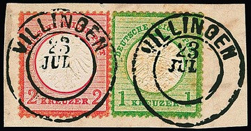 "Villingen", nachverw. K2 klar auf Briefstück mit Mischfrankatur 2 Kr. kleines (tadellos) und 1 Kr. großes Brustschild (diese etwas getönt), Fotoexp. Krug