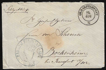 Feldpost, 1870, kleiner K2 "GR. BAD. FELDPOST" klar auf Couvert, nebst Truppenstempel, nach Bockenheim