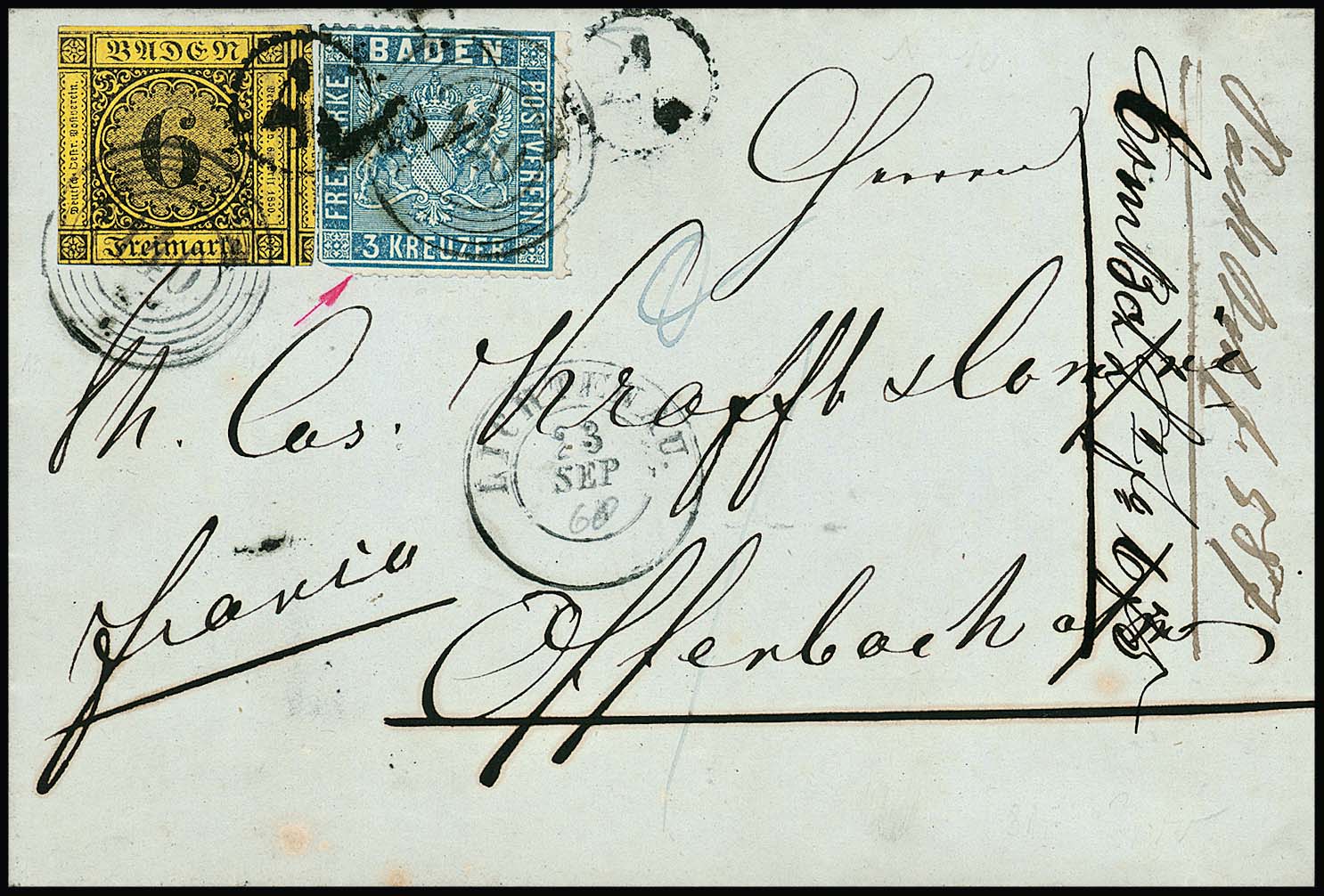 6 Kr. schw./orangegelb, üblicher Schnitt, in Mischfrankatur mit 3 Kr. preußischblau (Randfehler), auf Brief mit besserem NS "140", Uhrrad "4" und K2 "Lichtenau" nach Offenbach, aus Stollhofen 1860