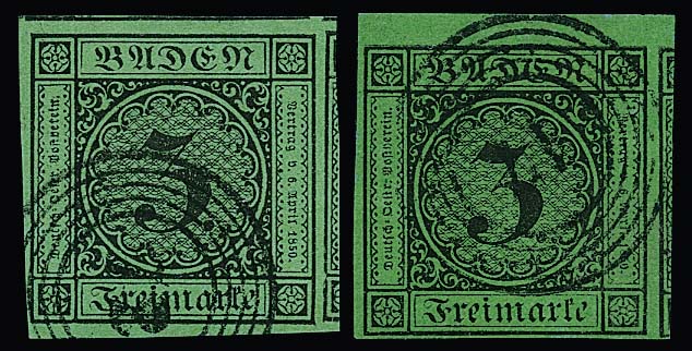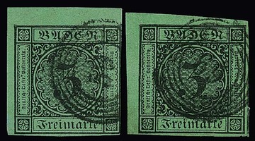 1 Kr. schwarz, voll- bis meist breitrandiges Kabinettpaar mit zentr. NS "43", Besonderheit: sowohl durchschlagender Druck als auch rechte Marke Plattenfehler III ("eingekerbte Randlinie oben"), Attest Stegmüller