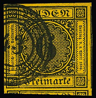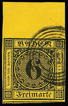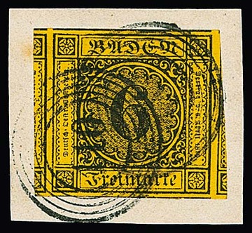 6 Kr. schw./gelborange, hervorragend breitrandiges Luxusstück vom Oberrand, zwei Seiten Nebenmarken (nur im weiten Überrand Vortrennschnitt), Fotoexp. Stegmüller